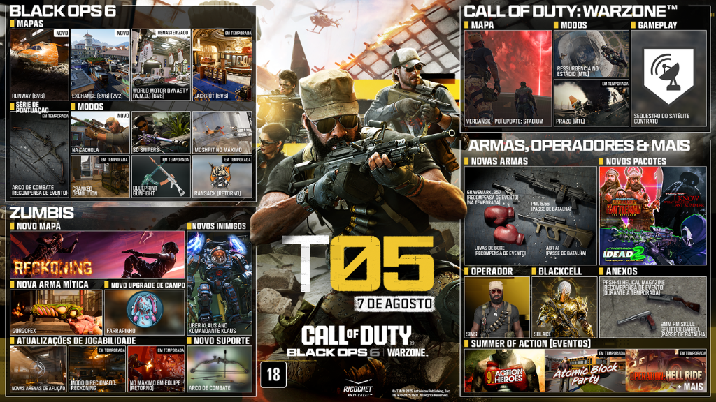 Prepare-se para o caos! A Temporada 5 de Call of Duty: Black Ops 6 e Warzone chega no dia 7 de agosto em todas as plataformas, trazendo uma enxurrada de novos conteúdos, mapas, modos e a conclusão da história de Zumbis para Black Ops 6. Em Warzone, Verdansk está prestes a mudar drasticamente, com uma força destrutiva em ação.