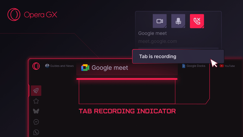 - Controle de Áudio Eficiente: Aquela reunião matinal está perdida em meio a várias abas? O Opera GX indica a aba com áudio ativo com um sutil sinal de gravação vermelho. Melhor ainda, você pode silenciar o áudio diretamente da aba com um clique. Se precisar alternar entre guias, o navegador transforma sua chamada em uma janela flutuante, mantendo você em contato visual sem interromper sua navegação.