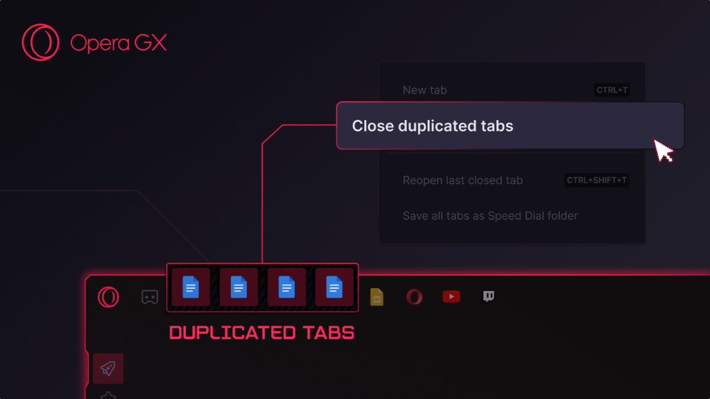 - Gerenciamento Inteligente de Abas: Cansado de abas duplicadas? Basta passar o mouse sobre elas que o Opera GX as identifica, permitindo que você organize seu fluxo de trabalho com um único clique no menu contextual.