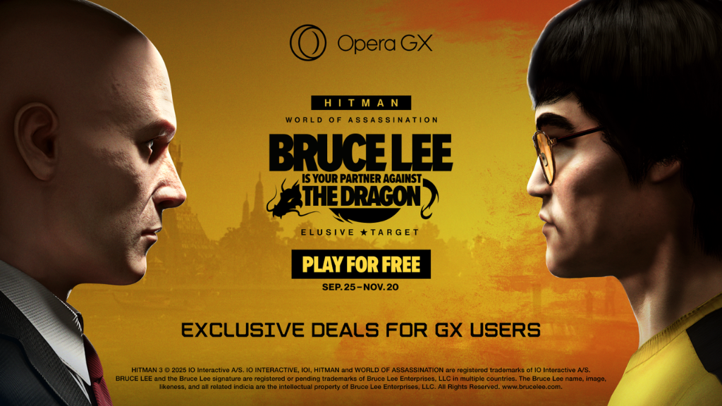 Em uma parceria estratégica com a IO Interactive, o Opera GX celebra o lançamento da nova missão de Alvo Elusivo de HITMAN World of Assassination, que traz a lenda do kung-fu, Bruce Lee. A colaboração garante aos usuários do navegador acesso a descontos exclusivos na nova DLC, o Pacote Bruce Lee, e em diversos jogos da franquia.