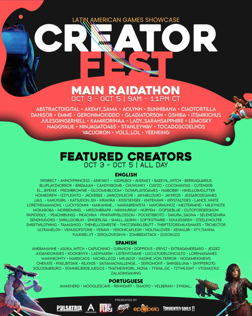 De 3 a 5 de outubro, o Latin American Games Showcase (LAGS) realizará a primeira edição da Creator Fest, um evento de transmissões online que celebra e apoia jogos desenvolvidos na América Latina. Em parceria com a Twitch Latin Guild, o evento contará com mais de 130 criadores de conteúdo transmitindo mais de 40 jogos latino-americanos, incluindo demos exclusivas e entrevistas com os desenvolvedores!