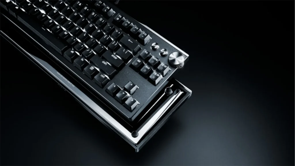 O chassi do Razer Huntsman Signature Edition é esculpido em alumínio 6063 anodizado via usinagem CNC. O grande diferencial, porém, está nos detalhes externos que recebem acabamento em PVD (Deposição Física de Vapor). Esse processo, comum em relógios de luxo e joias, passa por um polimento manual para atingir um brilho espelhado inigualável.