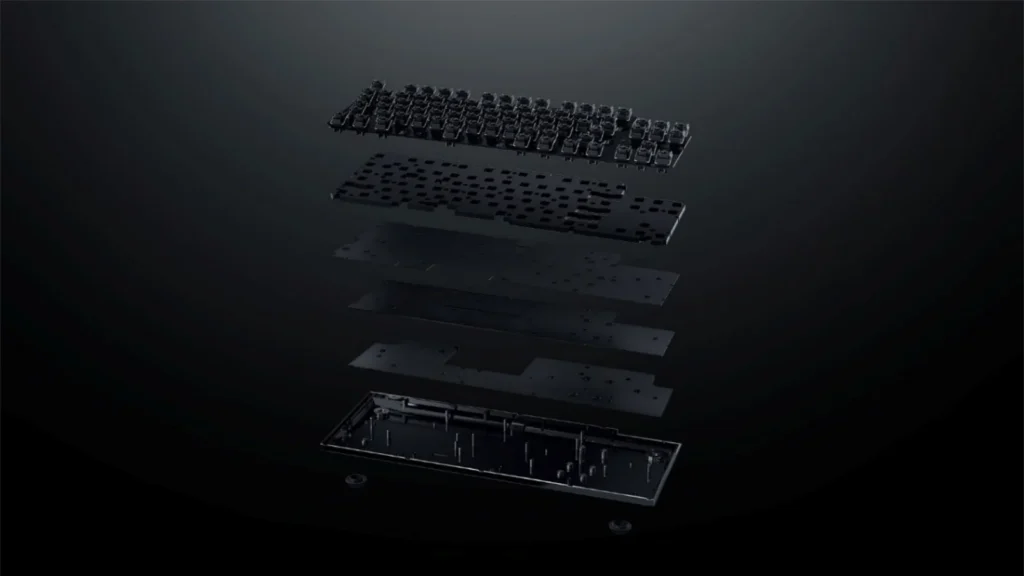 A atenção aos detalhes se estende às keycaps em PBT doubleshot e às teclas metálicas personalizadas com o logotipo da serpente de três cabeças. Internamente, o teclado possui camadas de espumas calibradas e amortecedores que criam uma assinatura acústica encorpada e refinada, garantindo que o som da digitação seja tão sofisticadamente ajustado quanto sua estética.