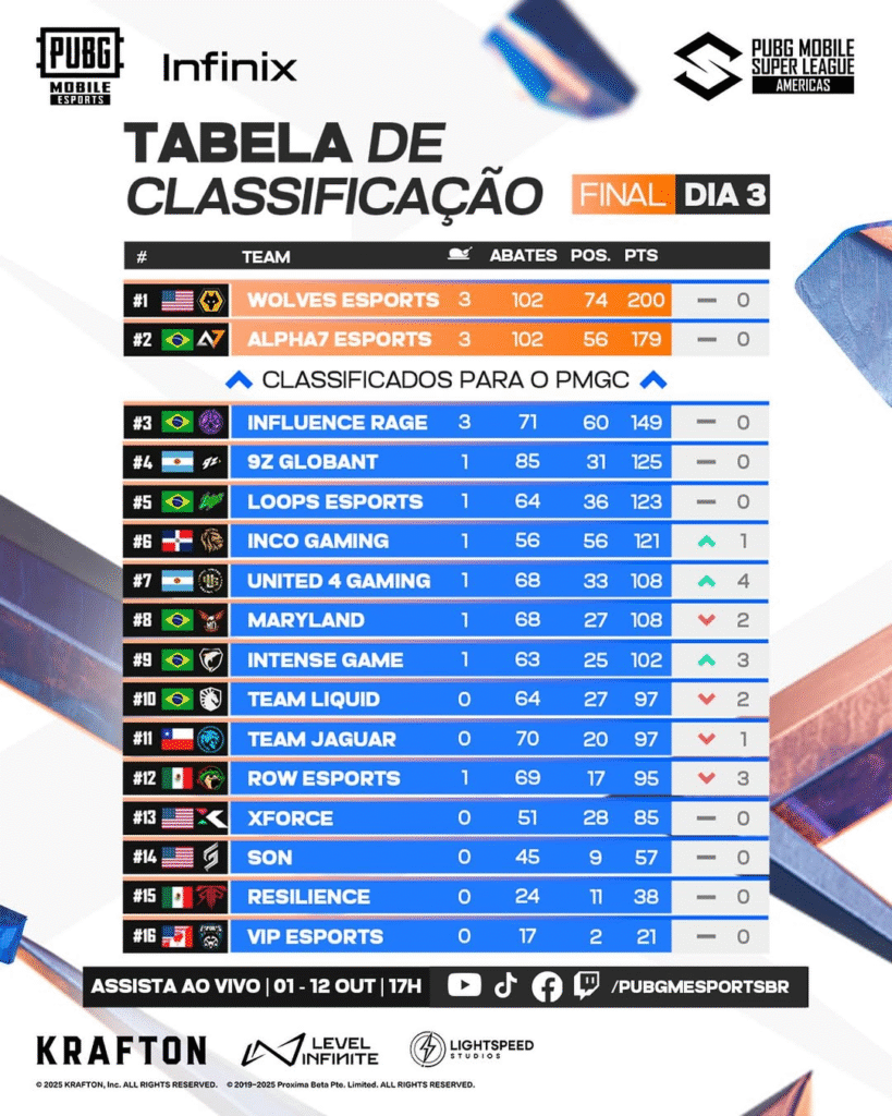Apesar de não terem conquistado o título, as equipes brasileiras mostraram sua força e garantiram três vagas para o PUBG MOBILE Global Championship (PMGC) 2025, que acontecerá em novembro na Tailândia. As equipes que representarão o Brasil são: